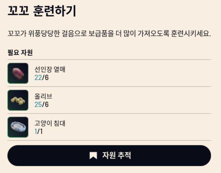 위의 아이템들인 고양이 침대, 선인장 열매, 올리브를 모두 모았다면, 이제 꼬꼬를 4레벨로 훈련시킬 수 있습니다.
