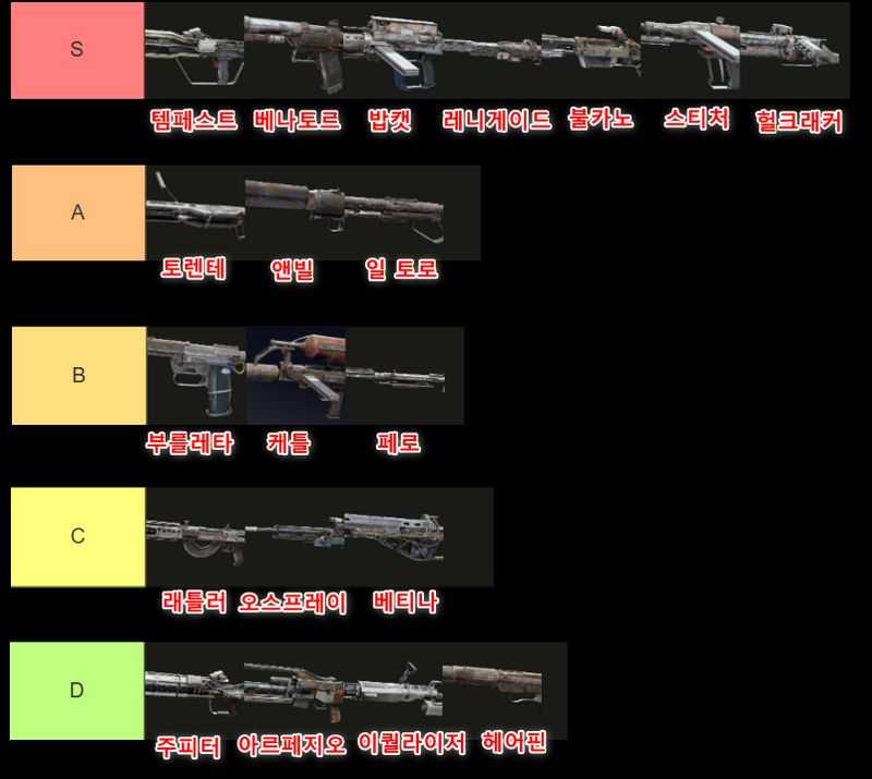 S티어 총기들은 다양한 상황에서 모두 유리한 점이 많으므로, 초보자부터 숙련자까지 사용할 수 있는 뛰어난 성능을 자랑합니다.