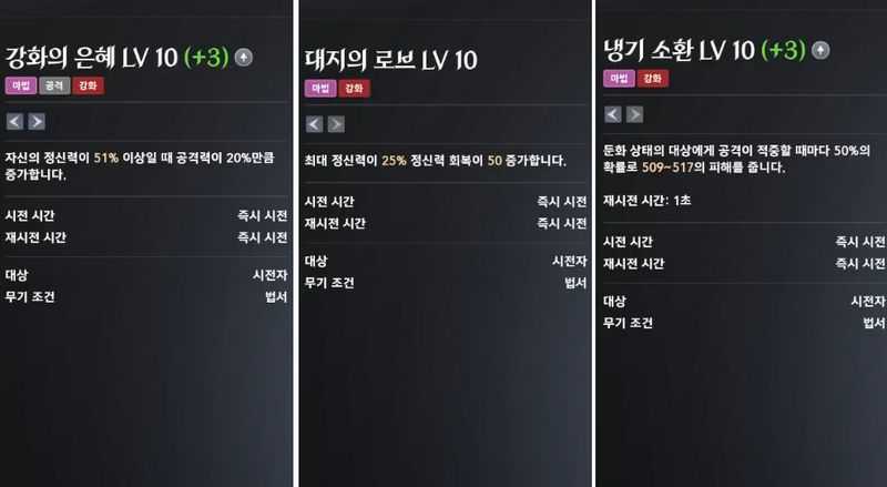 마도성의 패시브 스킬은 강화의 은혜, 대지의 로브, 냉기 소환을 추천합니다.