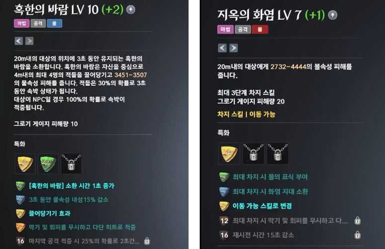 - 혹한의 바람은 주변 적에게 물 속성 피해를 주고, 속박시킬 수 있는 스킬입니다. 이를 레벨 7까지 찍고, 지옥의 화염은 반드시 레벨 10까지 찍어야 합니다. 지옥의 화염의 특화 옵션에서 “이동 가능 스킬로 변경”을 선택하는 것이 좋습니다.