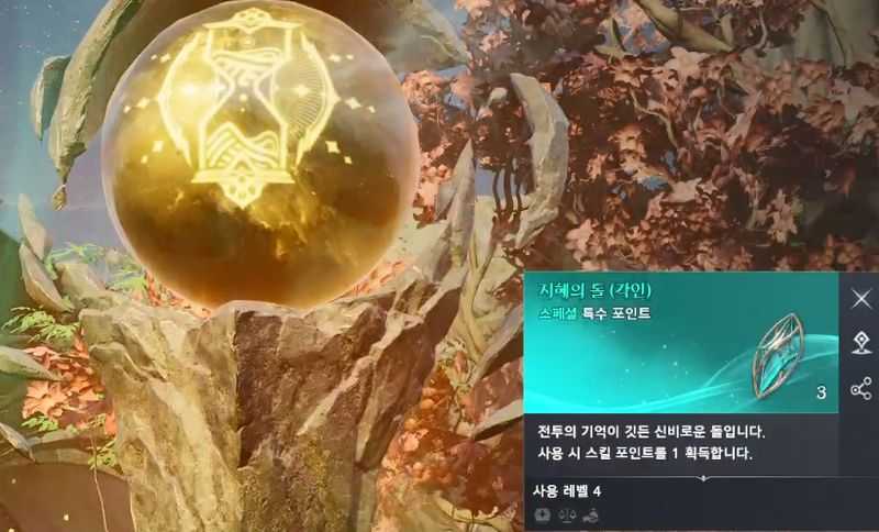 주신의 흔적을 모은뒤 모노리스에 공명하여 지혜의 돌을 획득하고, 이를 사용해 스킬 포인트를 얻을 수 있습니다. 빠른 성장을 위해서는 주신의 흔적을 놓치지 말고 파밍하세요.