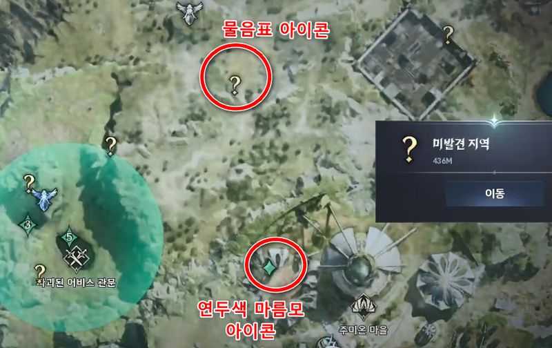 지도 상에 연두색 마름모 아이콘은 서브 퀘스트, 물음표 아이콘은 봉인 던전입니다.
