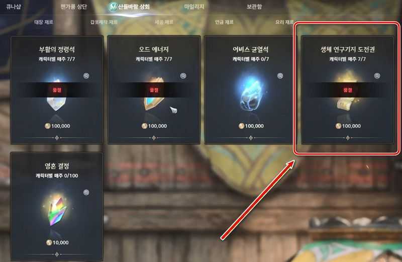 산들바람 상회에서 생체 연구기지 도전권캐릭터별로 매주 7장 구매할 수 있어, 이를 통해 강화석을 대량으로 얻을 수 있습니다.