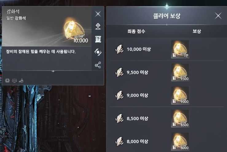 • 최종 점수가 높을수록 보상으로 더 많은 강화석을 받을 수 있습니다.