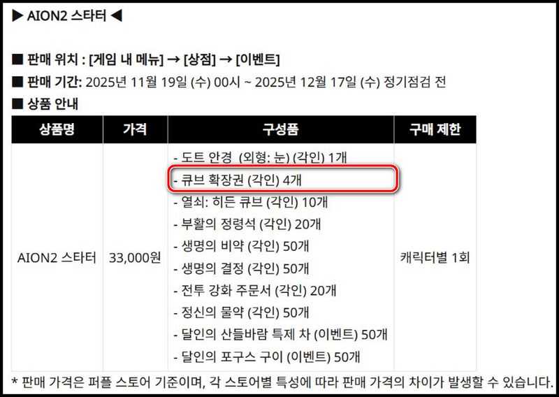 2) AION2 스타터 구매로 큐브 확장권 확보