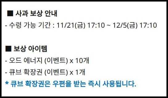 예를 들어, 2025년 11월 21일에 있었던 사과 보상에서는 큐브 확장권 1개를 지급한 적이 있었습니다.
