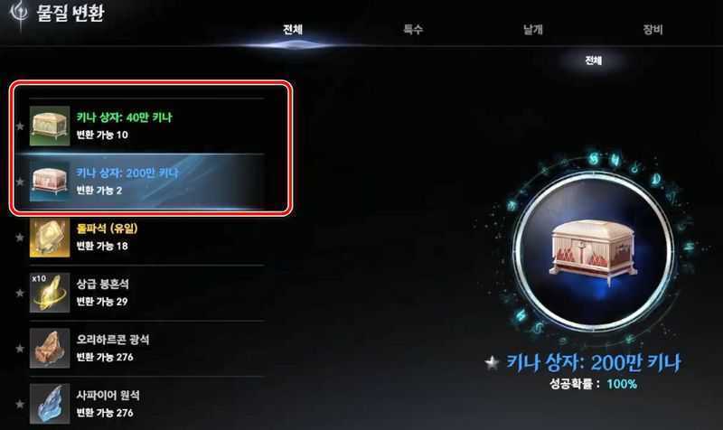 키나 상자는 40만, 200만, 1,000만 키나가 있으므로, 보유한 키나에 맞게 변환합니다.