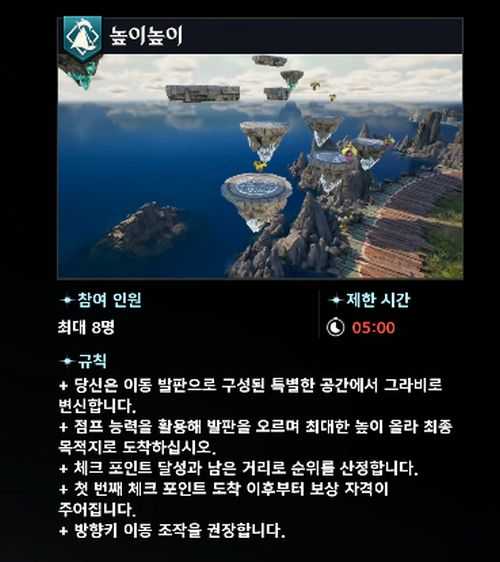 이벤트가 시작되면 모든 참가자는 그라비로 변신해 점프 맵을 올라가야 합니다. 좌우 방향에 상관없이 점프해서 최대한 높이 올라가는 것이 목표입니다.