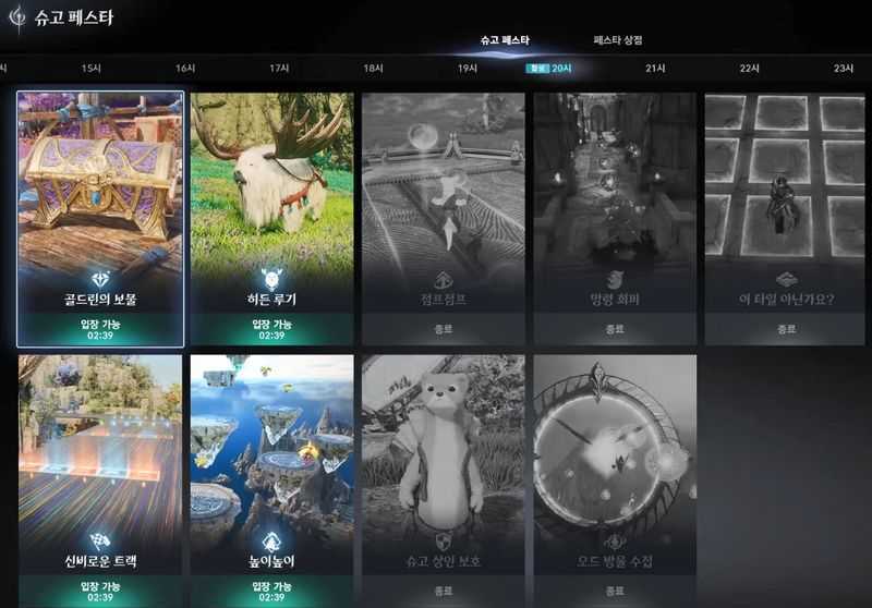 슈고 페스타는 아이온2의 짧은 미니게임 모음입니다. 매시 15분과 45분마다 다양한 퍼즐 게임이 열리며, 참여자는 원하는 콘텐츠에 입장할 수 있습니다.