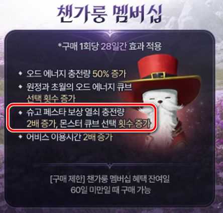 챈가룽 멤버십을 구독하는 경우, 큐브 선택 횟수가 2배로 증가하여 보상 획득에 유리한 점이 있습니다.