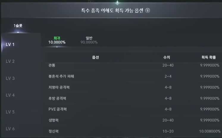 반면, 특수 종족의 이해도는 1레벨부터 공용 옵션을 제공합니다.