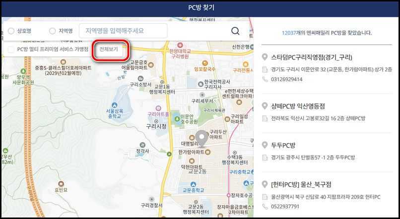 만약 PC방 상호명을 안다면, 상호명으로 검색하면 더욱 빠르게 확인할 수 있습니다.