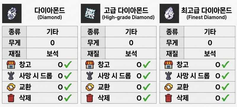 다이아몬드는 단순 재료가 아니라 제작, 시세, 성장 전략을 좌우하는 핵심 자산입니다.