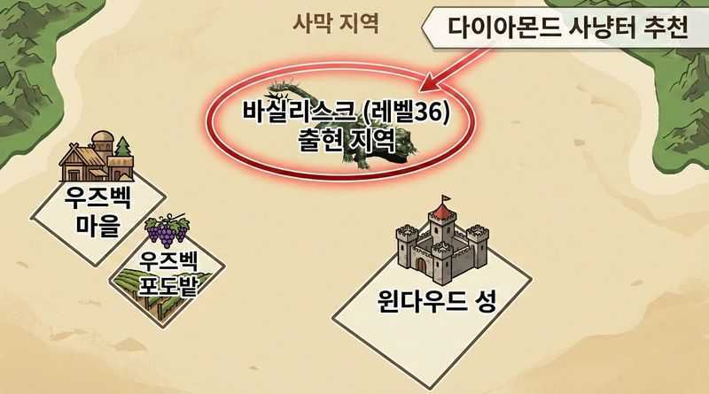 다이아몬드 파밍 추천 지역은 사막 지역 바실리스크 사냥입니다.