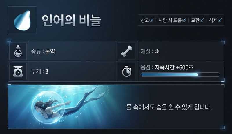 특히 새롭게 추가된 수중 던전 콘텐츠에서 중요한 역할을 하기 때문에, 하이네 업데이트 이후 활용도가 크게 높아진 아이템입니다.