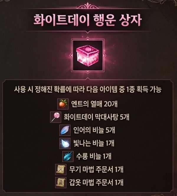 화이트데이 행운 상자를 열면 확률적으로 다양한 아이템을 얻을 수 있으며, 그중 인어의 비늘 5개를 획득할 수도 있습니다.
