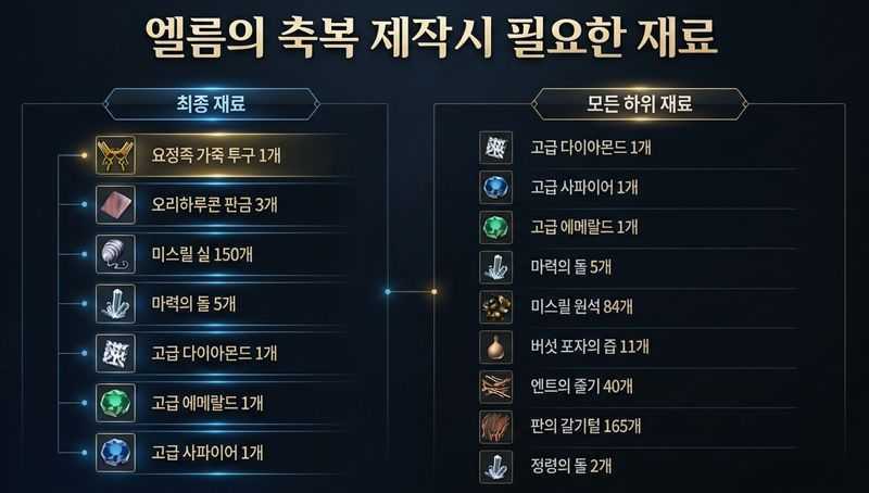 이 글에서는 엘름의 축복 제작에 필요한 모든 재료와 단계별 제작 방법, 그리고 구매와 제작 중 어떤 선택이 유리한지까지 핵심만 정리해보겠습니다.