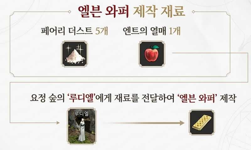 재료를 모두 모았다면 요정 숲의 루디엘에게 전달하면 엘븐 와퍼를 제작할 수 있습니다.